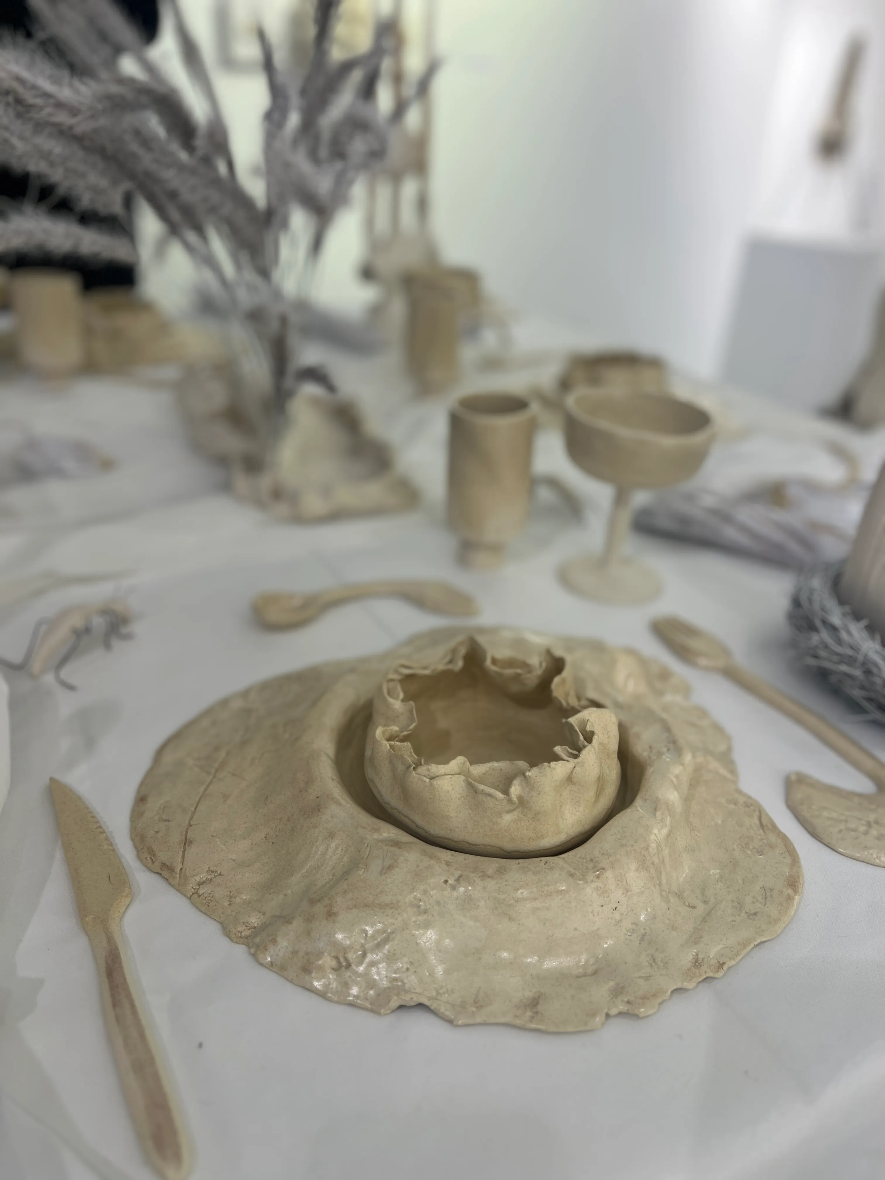 Desarrollé una instalación multidisciplinar que combina piezas cerámicas con detalles textiles para representar una cena íntima donde convergen estorninos danzantes y sus observadores. Conceptualicé esta obra para resaltar la importancia de los momentos de pausa al final del día, transformando la inacción en una forma consciente de acción reflexiva. La instalación invita al espectador a valorar esos instantes de transición como espacios fundamentales para la contemplación y el balance personal.